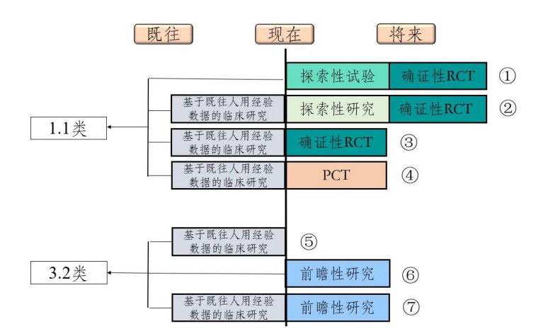 “现在”的分界点:路径①和③为获得临床试验许可的时间;路径②和④为获得临床研究许可的时间,或与监管机构沟通交流达成共识后的时间;路径⑤为提出上市申请的时间;路径⑥和⑦为与监管机构沟通交流达成共识后的时间。